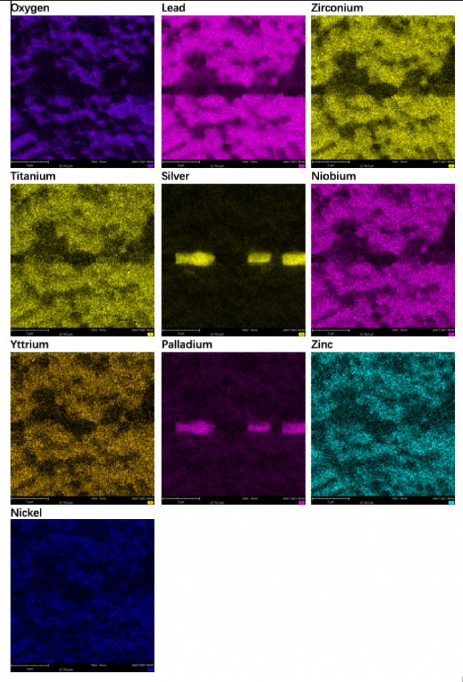 陶瓷層與中間的電極層能譜面掃結(jié)果,電極層主要成分是 Ag-Pd 合金