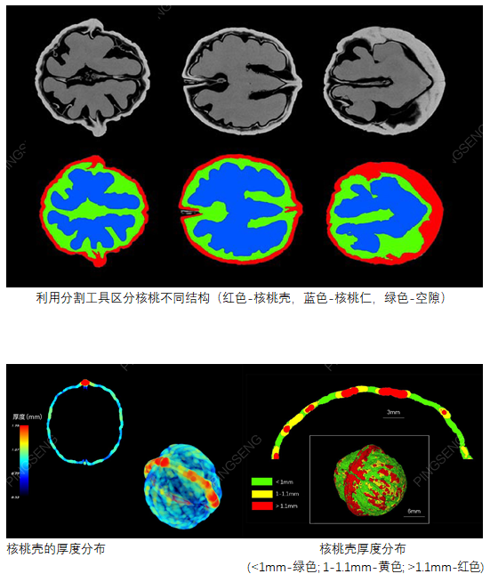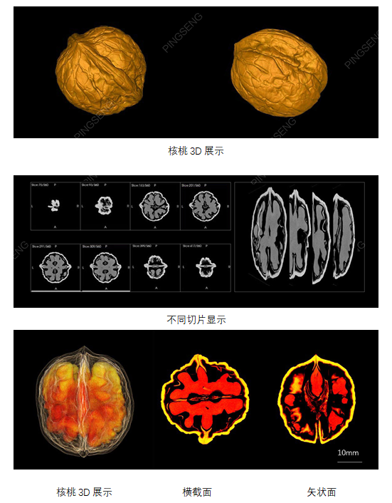 核桃又稱胡桃,與扁桃、腰果、榛子并稱為世界著名的“四大干果”。核桃仁含有豐富的營養(yǎng)素,除了蛋白質(zhì)和脂肪外,還含有人體必需的鈣、磷、鐵等多種微量元素和礦物質(zhì),以及胡蘿卜素、核黃素等多種維生素。隨著老百姓對核桃需求的日益增多,對核桃的品質(zhì)也提出了越來越高的需求。這些品質(zhì)包括核桃仁的占比、外殼厚度、外殼是否容易開裂、外殼光滑程度、形狀、尺寸等。傳統(tǒng)方法需要對樣品進行破壞才能測量,而使用Micro-CT產(chǎn)品可以快速、無損,準(zhǔn)確的測量,在不破壞樣品的前提下,對核桃內(nèi)部結(jié)構(gòu)進行觀察和定量分析