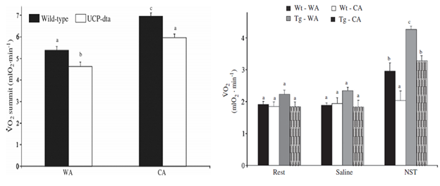 左圖:寒冷條件下(CA)的耗氧率VO2均大于溫暖條件下(WA)的耗氧率,野生型小鼠最大代謝率高于UCP-dta小鼠;右圖:在休息時、注射鹽水和注射去甲腎上腺素后的耗氧率,UCP-dta小鼠和野生型小鼠寒冷條件下耗氧率VO2NST顯著高于溫暖條件下。