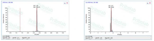 黃曲霉毒素混合同位素內標工作液:13C17-AFB1:13C17-AFB2:13C17-AFG1:13C17-AFG2為0.5 ug/mL