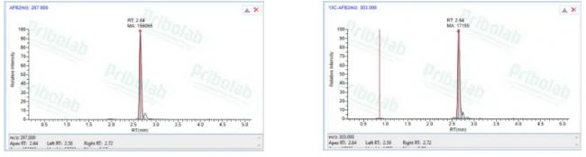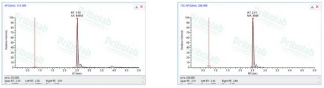 稱取 5g試樣+50uL混合標準工作液+40uL混合同位素內標工作液+84%乙腈 20mL→振蕩30min→離心 10min(離心速度 4000r/min)→取上清液過PriboFast®MFC226固相凈化柱→取4mL凈化液+46mL吐溫PBS稀釋→將全部稀釋液通過PriboFast®AFT免疫親和柱→先用10mLPBS淋洗,再用10mL水淋洗免疫親和柱→棄去淋洗液,使空氣進入柱子,將水擠出柱子→用2mL甲醇洗脫,收集洗脫液于試管中→50℃下氮氣吹至近干,用流動相復溶→微孔濾膜(0.22μm)過濾,取濾液上機。