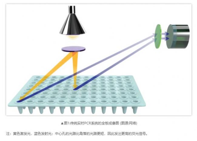 ROX是一種廣泛使用的惰性熒光染料,通常添加到qPCR反應(yīng)液中以校正熒光信號(hào)。然而,隨著熒光技術(shù)在儀器中的發(fā)展,比如在Azure Cielo™實(shí)時(shí)熒光定量PCR系統(tǒng),為了標(biāo)準(zhǔn)化而單獨(dú)使用染料的步驟已不再需要。當(dāng)實(shí)時(shí)熒光定量PCR系統(tǒng)首次引入市場(chǎng)時(shí),許多產(chǎn)品使用固定光源和檢測(cè)系統(tǒng)對(duì)96孔整板進(jìn)行同時(shí)成像,導(dǎo)致熱塊中每個(gè)孔的光路不同(圖1)。光程差異將導(dǎo)致每個(gè)孔的絕對(duì)熒光測(cè)量值發(fā)生變化,這取決于它們?cè)诎迳系奈恢谩@,具有較短光程的孔可能比具有較長(zhǎng)光程的孔具有更高的熒光讀數(shù),從而導(dǎo)致兩孔之間的熒光值偏差增大。因此,許多研究者開(kāi)始使用參考染料(如ROX)對(duì)這種信號(hào)變化進(jìn)行標(biāo)準(zhǔn)化校正。