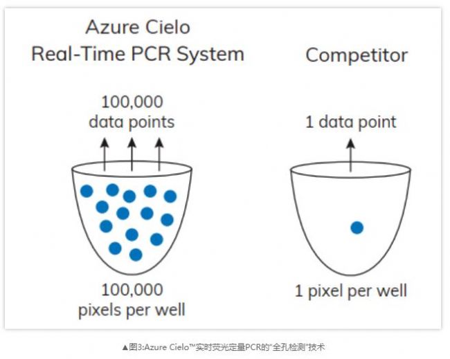 Azure Cielo™實(shí)時(shí)熒光定量PCR系統(tǒng)采用新型的高性能光學(xué)系統(tǒng),在qPCR實(shí)驗(yàn)中無(wú)需ROX校準(zhǔn)。該光學(xué)系統(tǒng)采用16組光纖單孔掃描設(shè)計(jì),一根光纖用于高能LED激發(fā),另一根用于光信號(hào)檢測(cè),可16孔同時(shí)采集,確保數(shù)據(jù)采集的一致性(圖2)。此外采用“全孔檢測(cè)”技術(shù),每個(gè)孔可采集大約100,000個(gè)數(shù)據(jù)點(diǎn),檢測(cè)時(shí)取讀數(shù)的平均值,精準(zhǔn)測(cè)定每個(gè)孔的熒光強(qiáng)度(圖3)。這種“全孔檢測(cè)”為每個(gè)采集時(shí)間點(diǎn)提供了比單孔掃描系統(tǒng)更具重現(xiàn)性和可靠性的數(shù)據(jù),因?yàn)閱慰讙呙柘到y(tǒng)僅僅采集少量的數(shù)據(jù)點(diǎn)。