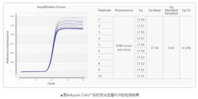 結(jié)果表明,Azure Cielo™實(shí)時(shí)熒光定量PCR系統(tǒng)能很好地檢測(cè)到每個(gè)qPCR擴(kuò)增產(chǎn)物。由圖4可知,10個(gè)重復(fù)孔的擴(kuò)增曲線高度一致,說(shuō)明所有孔檢測(cè)到的信號(hào)均勻增加;計(jì)算得出Cq平均值為17.54,標(biāo)準(zhǔn)偏差低至0.02。Cq值的變異系數(shù)(CV)為0.13%,也反映了數(shù)據(jù)的高精準(zhǔn)度。