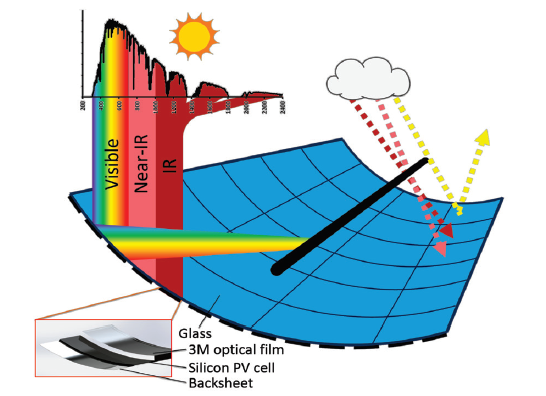 曲面型光電模塊的渲染和原理圖。3M可見(jiàn)鏡膜能夠使模塊在可見(jiàn)光區(qū)表現(xiàn)為鏡像,而在近紅外光區(qū)變?yōu)楹谏?br />
