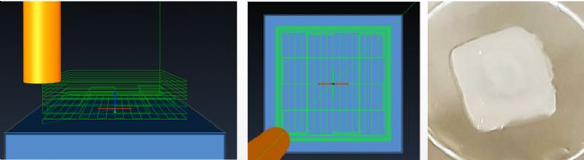 圖2.培養(yǎng)14天后的3D生物打印模型的示意圖,側(cè)視圖(左)和頂視圖(中)以及生物打印的皮膚組織模型的圖像(右)。