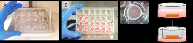 圖3. A)生物打印的zhen皮籃子。 B)3D生物打印的皮膚組織模型轉(zhuǎn)移到Transwell插入物中。 C)從皮膚組織模型的浸沒培養(yǎng)到氣液界面培養(yǎng)的轉(zhuǎn)移的圖示。