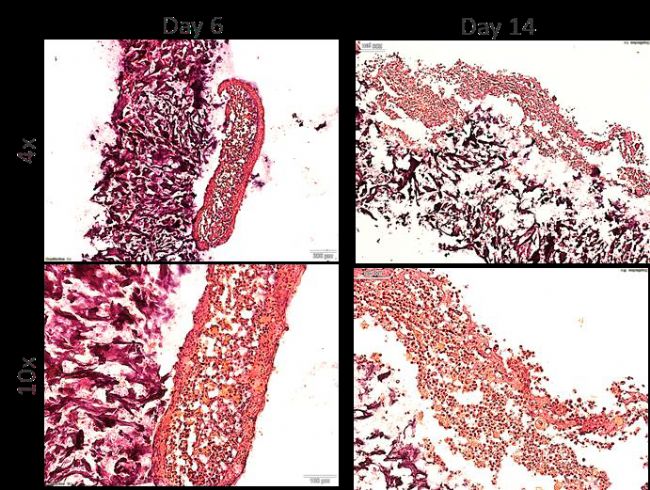 用于該皮膚組織模型的制造方法創(chuàng)建了完整且堅固的構(gòu)造,該構(gòu)造在整個實驗過程中保持其形狀。 樣品橫截面的H&E染色最初顯示,兩個隔層(zhen皮和表皮)之間的連接較弱。 但是在第14天,這兩層已經(jīng)合并(圖4)。 在第14天,可以看到表皮平滑地沿著zhen皮的輪廓移動,并且角質(zhì)形成細胞開始重組。