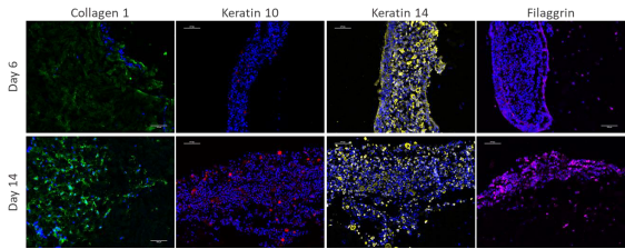 仔細觀察表皮的發(fā)育,免疫熒光圖像顯示整個培養(yǎng)過程中都保持了角蛋白14的表達,而在第14天角蛋白10和絲聚蛋白的表達均增加。 在表皮的中部,而角蛋白層(角質(zhì)層的標記)應(yīng)在表皮的最外層。 角蛋白10和絲蛋白的表達明顯增加表明角質(zhì)形成細胞已經(jīng)開始分化。 在第14天,絲聚蛋白表達重新定位到構(gòu)建體的頂部,朝向氣-液界面,顯示了細胞在生物打印模型內(nèi)重組的能力。