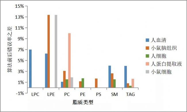 同時(shí),在增加了保留時(shí)間預(yù)測(cè)算法之后,常見幾大類的脂質(zhì)的錯(cuò)誤率均有所下降。其中,針對(duì)小鼠腦組織樣本類型,LPE、PC、PE、PS、SM和TAG的錯(cuò)誤率均有一定的下降;而各樣本類型中PC的錯(cuò)誤率能夠穩(wěn)定得到降低。