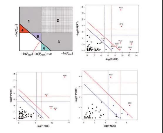如圖2,左上角x軸是PNDE,y軸是PPERT,如果單獨(dú)有兩個(gè)維度選擇顯著通路,PNDE選擇區(qū)域2、3、6;PPERT選擇區(qū)域1,2,4;SPIA選擇1、2、3、5。