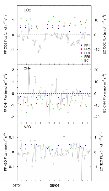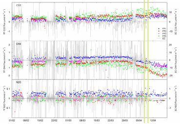 渦度相關(guān)法測量的CO2,CH4,N2O通量(EC,灰色,半小時值)和森林土壤源(FF,藍(lán)色,紅色,品紅,綠色)從2017年2月到4月中旬(4個土壤自動箱目前在運行)。