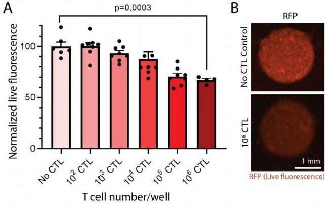 圖 3. 在第 5 天使用 3D 生物打印的腫瘤模型進(jìn)行 T 細(xì)胞細(xì)胞毒性測(cè)定。(A)觀察到 T 細(xì)胞濃度依賴性地降低了腫瘤細(xì)胞的活力,這是通過(guò) RFP 熒光的喪失來(lái)確定的。 CTL 的數(shù)量代表每孔的總 CTL。 (B)顯示了在存在或不存在 T 細(xì)胞的情況下打印的腫瘤的代表性圖像。 使用相同的采集參數(shù)拍攝圖像。