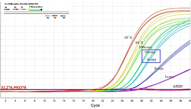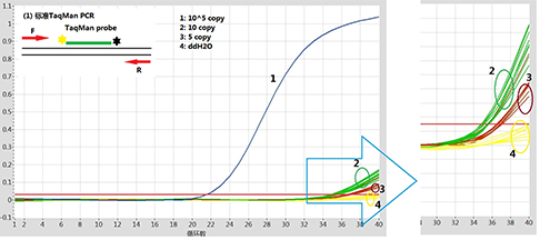 | 圖A:傳統(tǒng)的TaqMan PCR法對10copy以下模板檢測困難, 通常Ct>35,不易判讀。 |