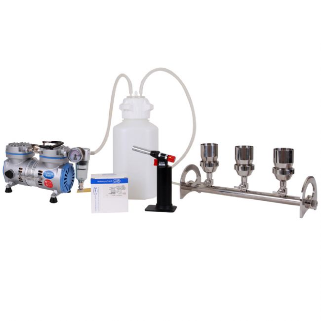 BV-300-B和BV-630B換膜不銹鋼多聯(lián)真空過濾系統(tǒng)是采用全不銹鋼材質(zhì)制作,其主體部分為一根316L不銹鋼支架,上面帶有對應(yīng)數(shù)量三個(gè)或六個(gè)的316L不銹鋼過濾杯。全不銹鋼使得客戶在操作中,沒做完一組樣品,可以使用標(biāo)配帶有手持式火焰噴槍進(jìn)行火焰燒灼消毒滅菌,以免樣品間的交叉污染。支架側(cè)邊配置了抽吸接口,可以連接于真空吸液瓶。吸液瓶帶有2個(gè)管接口,其中一個(gè)用于連接支架,另一端連接于抽濾泵。下面我們再來介紹使用方法和注意事項(xiàng):