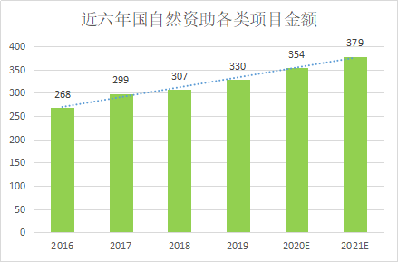 依據(jù)國家自然科學基金委員會官網(wǎng)2016-2019年度報告顯示,我們國家每年國自然資助金額增長約7.2%,小趣預測2020年國自然資助總金額約354億元,2021年將達到379億元。