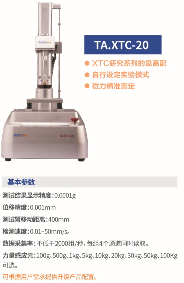 高精度力學(xué)分析儀器TA.XTC-20特別適用于高精度材料物性品質(zhì)研究,反應(yīng)靈敏,根據(jù)樣品形態(tài)可智能調(diào)節(jié)追蹤速率,對于微針、微球、微膠囊等精細(xì)樣品力學(xué)性能準(zhǔn)確測定。
