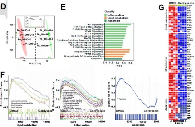 為研究蟲草素對代謝應(yīng)激下肝細(xì)胞脂質(zhì)堆積和炎癥的影響,通過混合脂肪酸PO(棕櫚酸,PA和油酸,OA)刺激LO2細(xì)胞。結(jié)果表明蟲草素有效降低了細(xì)胞內(nèi)的脂滴蓄積、甘油三酯(TG)和血清總膽固醇 (TC)含量、脂肪酸合成(FASN、SCD1、ACCα、PPARγ)和炎癥(IL-6、TNFα、CCL5、CXCL10)相關(guān)基因的表達(dá)。為系統(tǒng)地評價(jià)蟲草素對肝細(xì)胞的影響,進(jìn)行了肝細(xì)胞RNA-Seq分析,結(jié)果表明組間的差異基因顯著富集于炎癥、脂代謝和凋亡相關(guān)通路,而且蟲草素能夠顯著下調(diào)富集在上述通路的差異基因的表達(dá)。