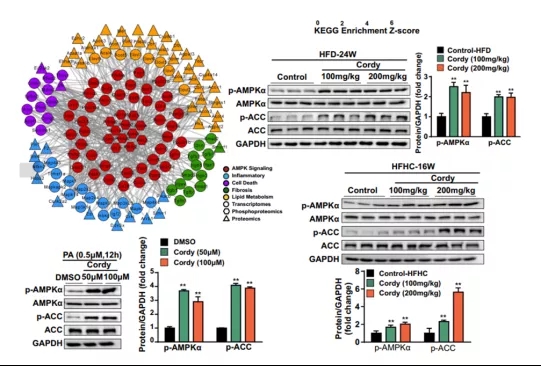 為進(jìn)一步探究蟲草素對NASH的保護(hù)機(jī)制,對細(xì)胞和小鼠的RNA-Seq結(jié)果進(jìn)行了通路富集,發(fā)現(xiàn)差異基因均主要集中在脂代謝、炎癥、纖維化和凋亡途徑,其中蟲草素對AMPK通路的影響優(yōu)于其他信號通路。通過多組學(xué)(轉(zhuǎn)錄組學(xué)、蛋白質(zhì)組學(xué)和磷酸化蛋白質(zhì)組學(xué))分析表明,AMPK通路與脂代謝、炎癥、纖維化和凋亡靶點(diǎn)顯著相關(guān),可能是蟲草素作用的關(guān)建通路。為確定蟲草素抗NASH是否通過AMPK途徑,研究者測定了細(xì)胞中、HFD和HFHC分別誘導(dǎo)的小鼠肝臟中AMPK通路中蛋白的表達(dá),發(fā)現(xiàn)蟲草素顯著激活了AMPK及其下游ACC蛋白的磷酸化。