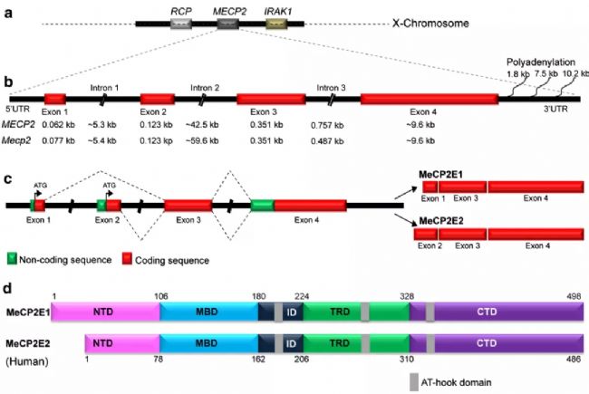 MeCP2基因位于X染色體上,其左右相鄰的基因分別為RCP和IRAK基因。在人類和大小鼠中,對該基因功能有顯著影響的是第1-4號外顯子和其中的3個內(nèi)含子。MeCP2蛋白主要由5個部分組成,首先是位于兩端的末端序列NTD(N-terminal Domain)和CTD(C-terminal Domain);中間則依次是是甲基化位點結合結構域,中間區(qū)域(interdomian)和轉錄抑制結構域。該蛋白理論上為53kd大小,不過由于其在翻譯后經(jīng)歷過一系列的修飾作用,其分子量在免疫印跡中大多為75kd。MeCP2在大多數(shù)組織中都或多或少有一定的表達,其中高表達的組織包括腦,肺和脾臟;相對地在肝,心,腎和小腸中表達較低。而在小鼠腦中,MeCP2的表達進一步以嗅球,紋狀體,皮層,海馬,丘腦,小腦和腦干中為最高。MeCP2的主要表達形式根據(jù)第一個外顯子是否翻譯分為E1和E2兩種。