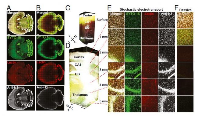 [6],可快速將抗體、染料輸送到致密的組織凝膠中,并允許在2或3天內(nèi)對完整的小鼠器官進行均勻的染色(而在依賴被動擴散的方法中,則是數(shù)周到數(shù)月)。為了確保免疫標記的一致性,采用