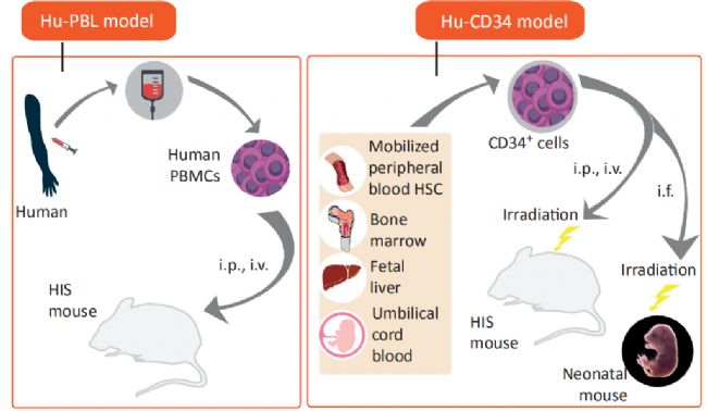 構(gòu)建方法:將來源于臍帶血、胎肝、骨髓,或動員后外周血的人CD34+造血干細(xì)胞(hematopoietic stem cell,HSC)通過尾靜脈、腹腔或骨髓腔,注射到經(jīng)亞致死劑量輻照(或經(jīng)化學(xué)藥物白消安Busulfan處理)進(jìn)行清髓以后的成年免疫缺陷小鼠體內(nèi);或者肝內(nèi)(intrahepatic)注射HSC到新生免疫缺陷小鼠體內(nèi)。
