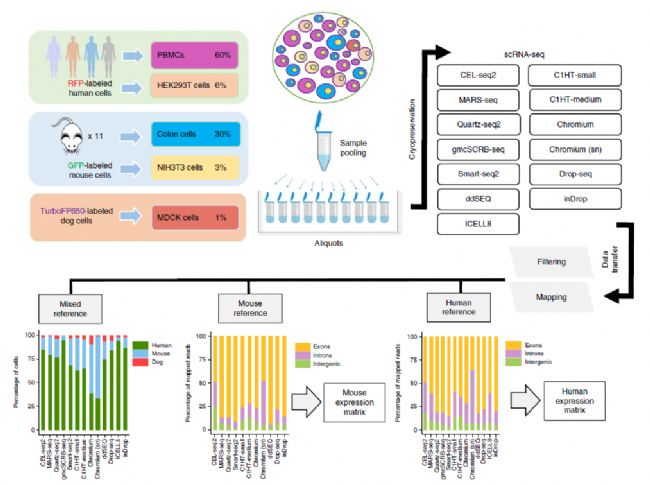 研究人員將來自3個物種,5種類型(圖1左上)的細(xì)胞進(jìn)行混合后,平均分成13份,分別進(jìn)行不同方法的單細(xì)胞測序。這些樣本具有如下特征: