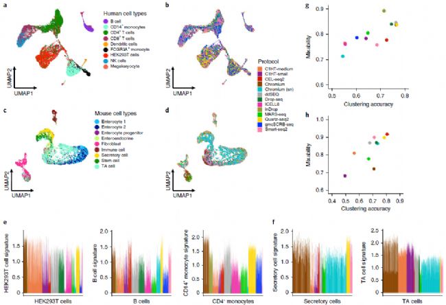 (h) cells. Protocols are compared according to their ability to group cell types into clusters (after integration) and mix with other technologies within the same clusters. Points are colored by sequencing method.