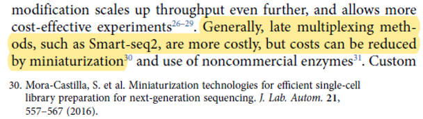 這篇文章的信息量非常大,作者還提到了諸如Smart-seq2這樣的成本較高的單細(xì)胞測序方法,可以通過微縮化的方式去降低成本,這點在SPT Labtech的mosquito納升級液體工作站上可以完美實現(xiàn)。