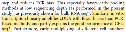 通過體外轉(zhuǎn)錄方式擴(kuò)增cDNA比基于PCR的方法產(chǎn)生的PCR偏好性更小,這也解釋了CEL-seq2的在檢測靈敏度等方面都表現(xiàn)出的良好性能。