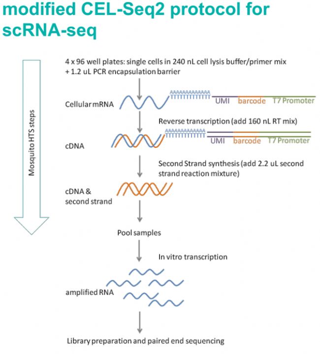 使用了mosquito進(jìn)行5倍微縮化的CEL-seq2單細(xì)胞cDNA合成,這也是德國馬克斯普朗克研究所優(yōu)化的CEL-Seq2 protocol(mCEL-seq2)。使用mosquito添加160nL裂解液和240nL RT mix,cDNA第一鏈合成僅在400nL體系內(nèi)進(jìn)行。