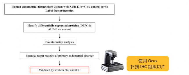 文章中包含了詳細(xì)的的實(shí)驗(yàn)流程如圖 1,對(duì)AUB-E病患(實(shí)驗(yàn)組)和健康女性(對(duì)照組)的子宮內(nèi)膜增生組織采樣,HPLC高效液相色譜解析并分離出樣品內(nèi)的蛋白。這些蛋白通過Liner Ion Trap(LTQ)-Orbitrap 離子阱和高場(chǎng)Orbitrap組合式質(zhì)譜的檢測(cè)(如定性/定量),并完成相應(yīng)數(shù)據(jù)的比對(duì)和處理。基于以上數(shù)據(jù),Cytoscape軟件(對(duì)蛋白質(zhì)相互作用路徑的預(yù)測(cè)分析)的富集分析法得DEPs(差異表達(dá)蛋白)結(jié)果,同SMC1A蛋白相關(guān)(具體圖示見原文)。隨后,大量的生信分析得出結(jié)論:SMC1A(染色體修復(fù)蛋白1A亞型)在AUB-E型體內(nèi)表達(dá)下調(diào),并得到Western blot和免疫組化兩種方法的雙重驗(yàn)證。其中,Ocus(芬蘭Grundium)用于對(duì)免疫組化(IHC方法)的組織切片,進(jìn)行數(shù)字化掃描和圖像保存、導(dǎo)出,如圖2。圖像分析得到AUB-E型病患的SMC1A 表達(dá)下調(diào),且對(duì)比Stromal間質(zhì)細(xì)胞,Glandular epithelium(腺上皮細(xì)胞) 的下調(diào)更明顯(促進(jìn)了大量腺上皮細(xì)胞增殖)。