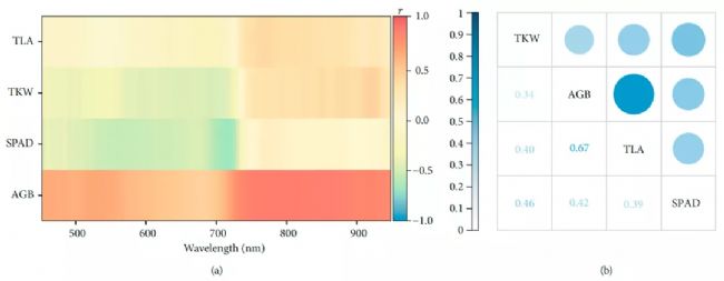 圖4 各參數(shù)與高光譜的相關(guān)性(a)及各參數(shù)之間的相關(guān)性(b)