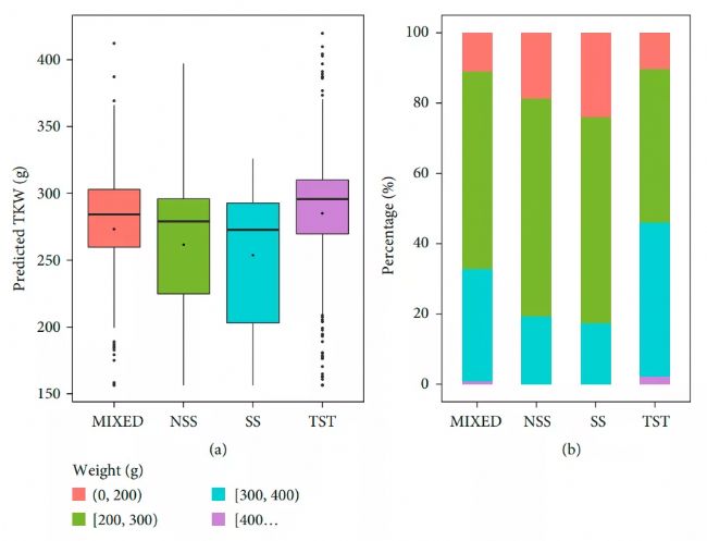 圖9 基于CARS-RF組合的玉米TWK預(yù)測(cè)結(jié)果。不同材料基因型的箱線圖(a)和產(chǎn)量水平百分比圖(b)論文第一作者為中國(guó)農(nóng)業(yè)大學(xué)土地科學(xué)與技術(shù)學(xué)院博士研究生束美艷,論文通訊作者為馬韞韜教授,合作者包括中國(guó)農(nóng)業(yè)大學(xué)的李保國(guó)教授、楊小紅教授,河南農(nóng)業(yè)大學(xué)的湯繼華教授,內(nèi)蒙古生物技術(shù)研究院的王瑞利研究員。該研究得到國(guó)家重點(diǎn)研發(fā)計(jì)劃項(xiàng)目(2016YFD0300202)、內(nèi)蒙古科技重大(2019ZD024)、成果轉(zhuǎn)化(2019CG093)和科技廳項(xiàng)目(2020GG00038)的支持。