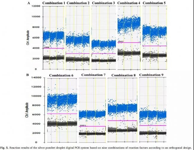 九種組合的銀鯧魚液滴數(shù)字PCR反應結果的正交設計,最終確認每個引物400nmol/l,水解探針200nmol/l,PCR擴