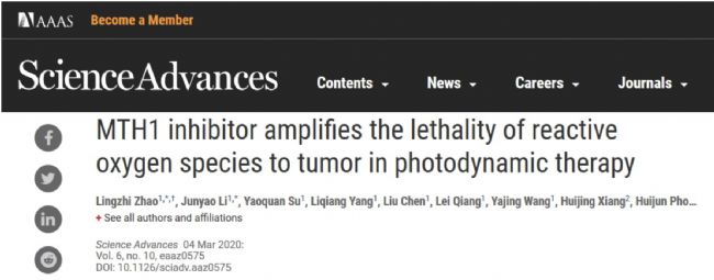 近日,中國(guó)藥科大學(xué)基礎(chǔ)醫(yī)學(xué)與臨床藥學(xué)學(xué)院趙靈之、彭娟娟團(tuán)隊(duì)在美國(guó)科學(xué)促進(jìn)會(huì)(AAAS)出版的期刊Science Advances(影響因子12.804)發(fā)表最新研究成果——MTH1 Inhibitor Amplifies the Lethality of Reactive Oxygen Species to Tumor in Photodynamic Therapy。第一通訊單位為中國(guó)藥科大學(xué),中國(guó)藥科大學(xué)趙靈之研究員與博士研究生李君耀為本文共同第一作者,趙靈之研究員、彭娟娟研究員與新加坡南洋理工大學(xué)趙彥利教授為共同通訊作者。