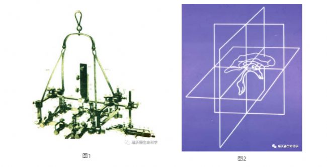 1908年,英國兩位科學家Victor Horsley和Robert H. Clarke首先發(fā)明了立體定位的方法(圖1),這種定位的方法成功運用了笛卡爾坐標系統(tǒng),即通過與三個平面的關系來定義空間中的一個點,每個平面均與另兩個垂直,并且所有的平面可相交于一個公共點(圖2)。