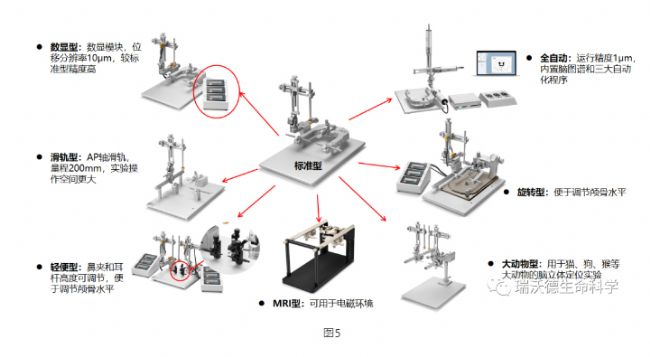 在推出首臺腦立體定位儀之后,瑞沃德陸續(xù)推出了一系列不同款式的定位儀,如輕便型、滑軌型、電磁兼容型及大動物型,滿足各類動物腦立體定位手術的需求(圖5),受到更多用戶的高度肯定。2007年,輕便型腦立體定位儀上市,適配器直接固定至底座上,不受經典的“U”型支架的束縛,動物頭部操作空間更大;2008年,推出滑軌型腦立體定位儀,AP方向(Y軸)設計為滑軌,前后位移距離200mm,滿足了嚙齒類動物脊髓手術操作的需求;2009年相繼推出了MRI型和大動物型腦立體定位儀,MRI型滿足了電磁環(huán)境下動物腦立體定位需求,大動物型定位儀可實現大動物如豬、狗、猴等大動物腦部的定位。