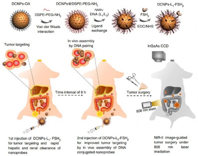 于此同時,文章作者通過在DCNPs表面修飾特定的DNA鏈和目標多肽,增強DCNPs對于腫瘤的靶向性,同時修飾兩種不同的DNA鏈以兩次注射的形式注入小鼠體內,使更多的納米顆粒能夠聚集在腫瘤部位,從而達到增加腫瘤:組織信號強度比的目的。信噪比的增加使得成像分辨率進一步增加,因而對于小于1 mm的瘤體也能做到精確切除。