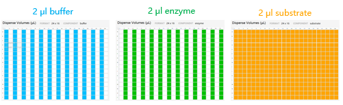 二、酶學(xué)實(shí)驗(yàn)dragonfly discovery除了在qPCR之外,還在很多藥篩實(shí)驗(yàn)和各種酶學(xué)實(shí)驗(yàn)(如TR-FRET,即HTRF時(shí)間分辨熒光共振能量轉(zhuǎn)移,ADP Glo和報(bào)告基因等)有廣泛應(yīng)用。以下是某CRO公司HTRF整個(gè)實(shí)驗(yàn)流程中涉及到3個(gè)試劑:底物、酶(一定粘性,容易產(chǎn)生氣泡)和buffer各2uL,分別用1根槍頭即可完成100塊384孔板的加樣。