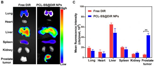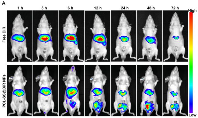 (A)、DU145荷瘤小鼠靜脈注射游離DiR和PCL-SS@DiR納米顆粒后的體內(nèi)熒光圖像。