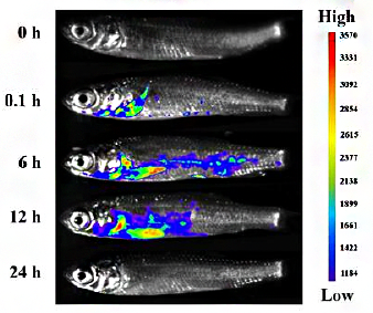 ▲ 使用博鷺騰AniView100拍攝的游離DiR和PCL-SS@DiR納米顆粒在DU145前列腺原位移植瘤小鼠體內(nèi)的熒光分布圖。