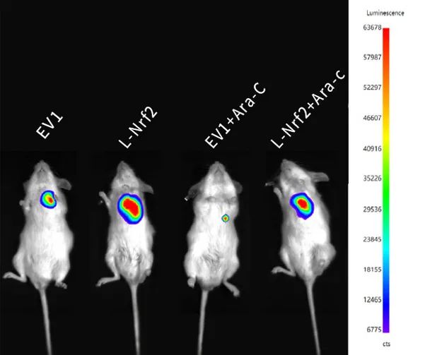(B)、使用博鷺騰AniView100拍攝的DU145荷瘤小鼠經(jīng)不同藥物組處理后的體內(nèi)生物發(fā)光圖像。