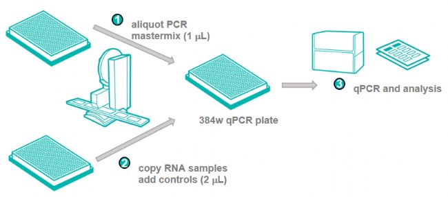 此外Helix與加州大學(xué)圣地亞哥分校(UCSD)合作進(jìn)行了COVID-19多重?zé)晒舛縋CR(multiplex real time RT-PCR)檢測,使用了TaqPath COVID-19 CE-IVD RT-PCR試劑盒,利用了mosquito添加1μL PCR mix和2μL RNA樣本,最終將反應(yīng)體系從25μL微縮化至3μL,