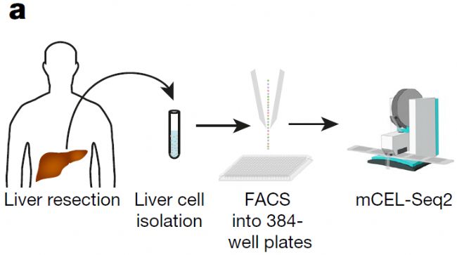 outline of the protocol used for scRNA-seq of human liver cells:Samples from liver resections were digested to prepare single-cell suspensions. Cells were sorted into 384-well plates and processed according to the mCEL-Seq2 protocol.