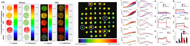 自左到右:.土壤小球藻環(huán)境毒理學研究(引自:Sun-Hwa Nam etc. Quantitative assessment of photosynthetic activity of Chlorella (Class Trebouxiophyceae) adsorbed onto soil by using fluorescence imaging, Environmental Pollution, 2019);微擬球藻葉綠素熒光成像(Fo)(引自:Giorgio Perin etc. Generation of random mutants to improve light-use efficiency of