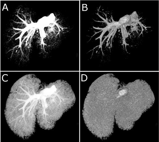 圖2 綜合分析閾值處理的MIP和體積渲染的數(shù)據(jù),可以更好地理解血管網(wǎng)絡。所有圖像都是同一個Microfil灌注的成年小鼠肝臟血管。(A)MIP和(B)體積渲染的血管,突出主要血管。(C)MIP和(D)體積渲染的血管,顯示全部血管。