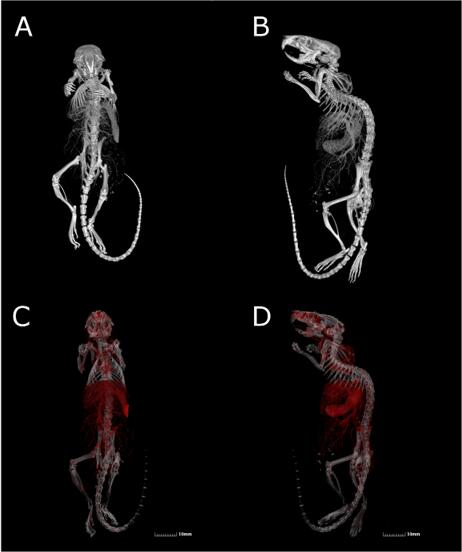 圖3 使用不透光的硅聚合物介質灌注后通過顯微CT進行完整的全裝標本血管成像。所有圖像來自同一個Microfil灌注的成年小鼠數(shù)據(jù)集。(A-B) 骨架和灌注的血管的體積渲染灰度圖像。(C-D) 灌注血管(紅色)和骨骼(白色)的體積渲染的偽彩圖像。