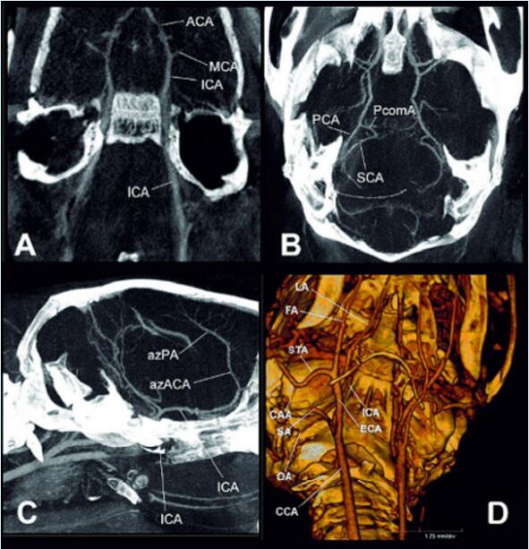 圖6 小鼠腦血管數(shù)據(jù)集的最大強度投影(MIP,A-C)和體積渲染(D)。圖像(A)顯示了大腦內部動脈(ICA)通過顱底和Willis圈的情況,其中包括大腦中動脈(MCA)和大動脈。大腦中動脈(MCA)和大腦前動脈(ACA),以彎曲的MIP形式呈現(xiàn)。圖片(B)是BALB/c小鼠的Willis圈的橫向視圖,顯示了大腦后動脈(PCA)、小腦上動脈(SCA)和后交通動脈(PcomA)。圖片(C)表示小鼠腦血管的矢狀圖。小鼠腦血管的矢狀面圖,可見舌周動脈(azPA)的小分支。D)顯示了小鼠顱外血管的體積圖,其中包括頸總動脈(CCA)、顱外動脈(ACA)等動脈。