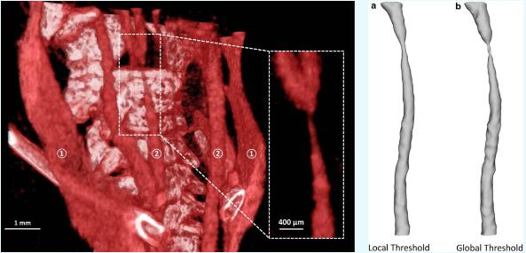 壁面剪切應力(WSS)參與了動脈粥樣硬化的病理生理學。使用WSS操縱的動脈粥樣硬化小鼠模型,可以調查WSS和動脈粥樣硬化之間的相關性。通過建立細節(jié)充分的血管網(wǎng)絡三維幾何形狀,可以幫助確定WSS。利用eXIA 160這種小動物造影劑,在顯微CT上評估小鼠血管網(wǎng)絡的充分性,并基于局部閾值分割算法對血管進行幾何分割。